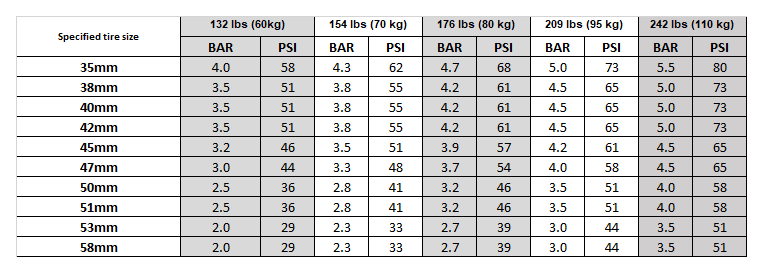 As a general rule, your tire should be pumped to an optimal pressure based on your weight and the tire size. The tire manufacturer provides a default tire pressure indication on the side stating maximum pressure. However, it is important to always read the manufacturer's indications and refer to a tire pressure data table for optimal riding experience based on your weight and tire size: