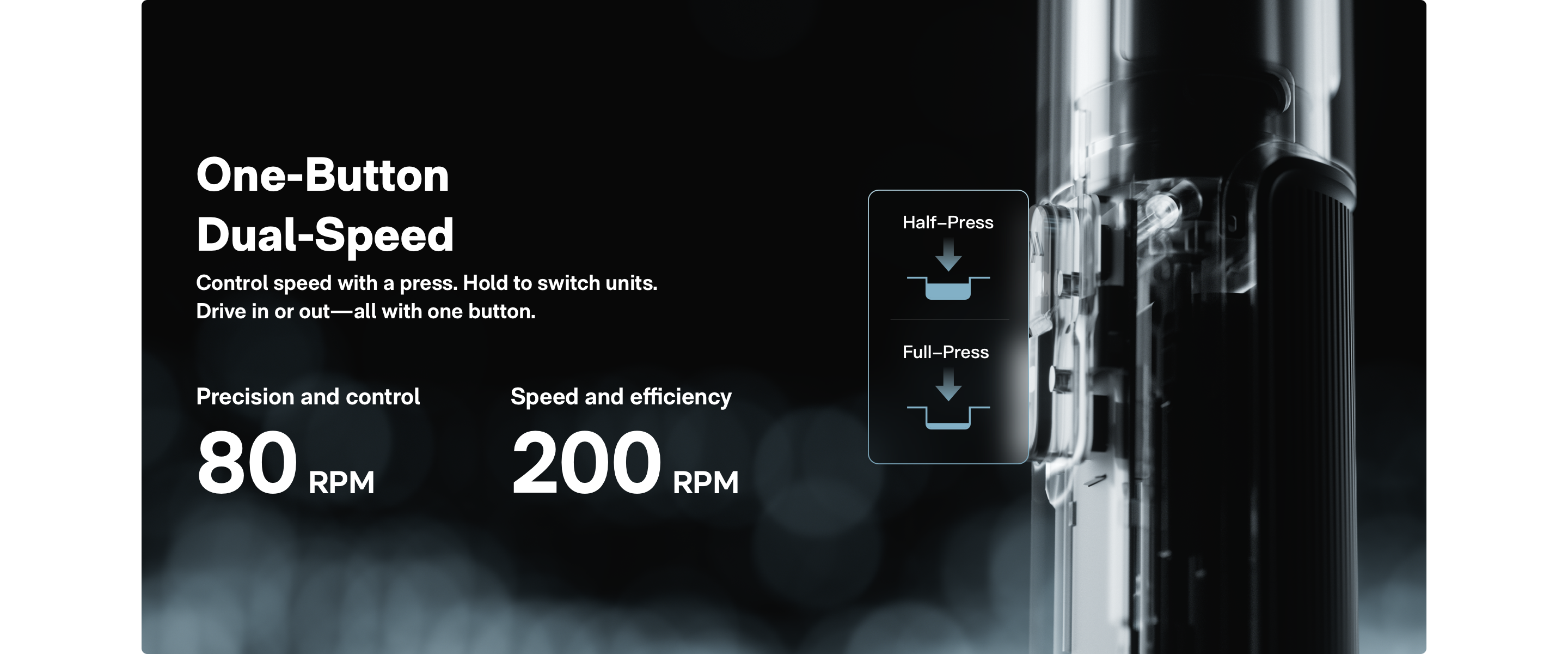 - One-Touch Multi-Function Button: Adjust speed with a press, switch units by holding, and drive in/out effortlessly—all with a single button.