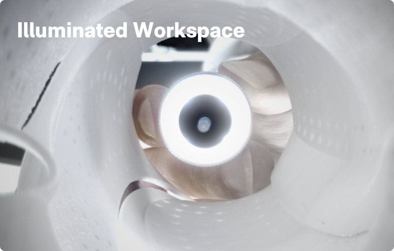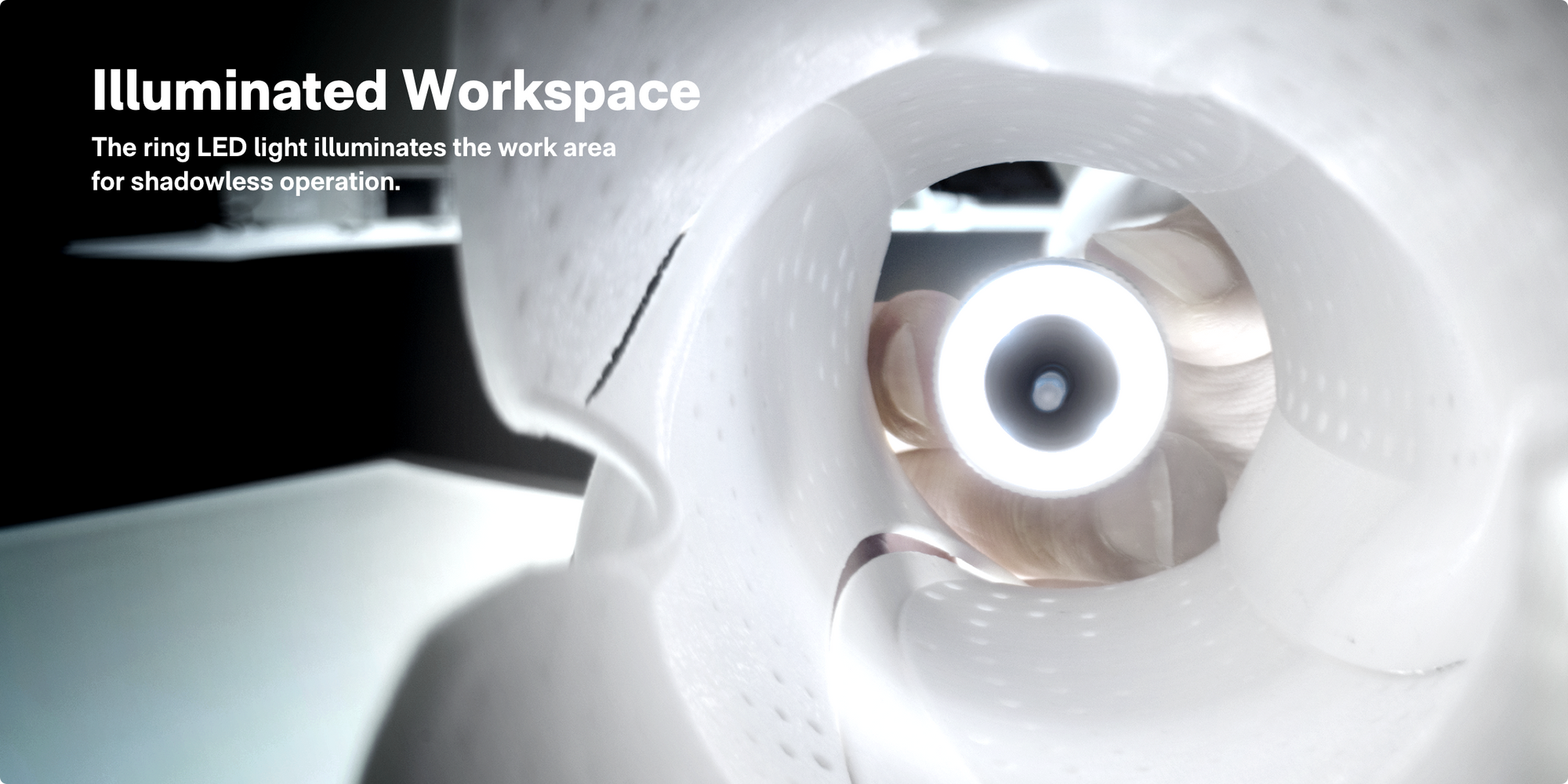 - Illuminated Workspace: The ring LED light illuminates the work area for shadowless operation.